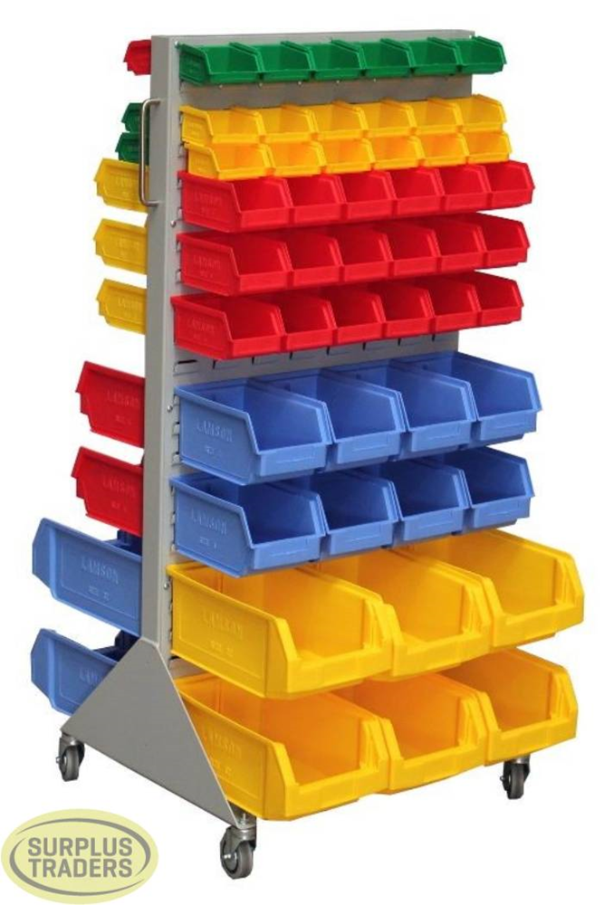 New Lamson Double Sided Mobile with TraysHeight 1270 mmWidth 630 mmDepth 540 mmThese are strong and durable and provide an ideal storage solution for a workshop where you do not have a wall to fix louvred panels to. The are manufacture from powdercoated mild steel and can hold up to 150kgs.This kit comes complete with the following quantity of bins.36 x Bins size 6 / 55H mm x 100W mm x 95D mm36 x Bins 5 / 80H mm x 100W mm x 165D mm16 x Bins 4 / 125H mm x 150W mm x 230D mm12 x Binz 3Z / 150H mm x 210W mm x 350D mmWe will exchange/refund or credit where new goods have been incorrectly described/are faulty or different from the example shown.We do not refund if you have changed your mind/have chosen the incorrect size/colour etc..