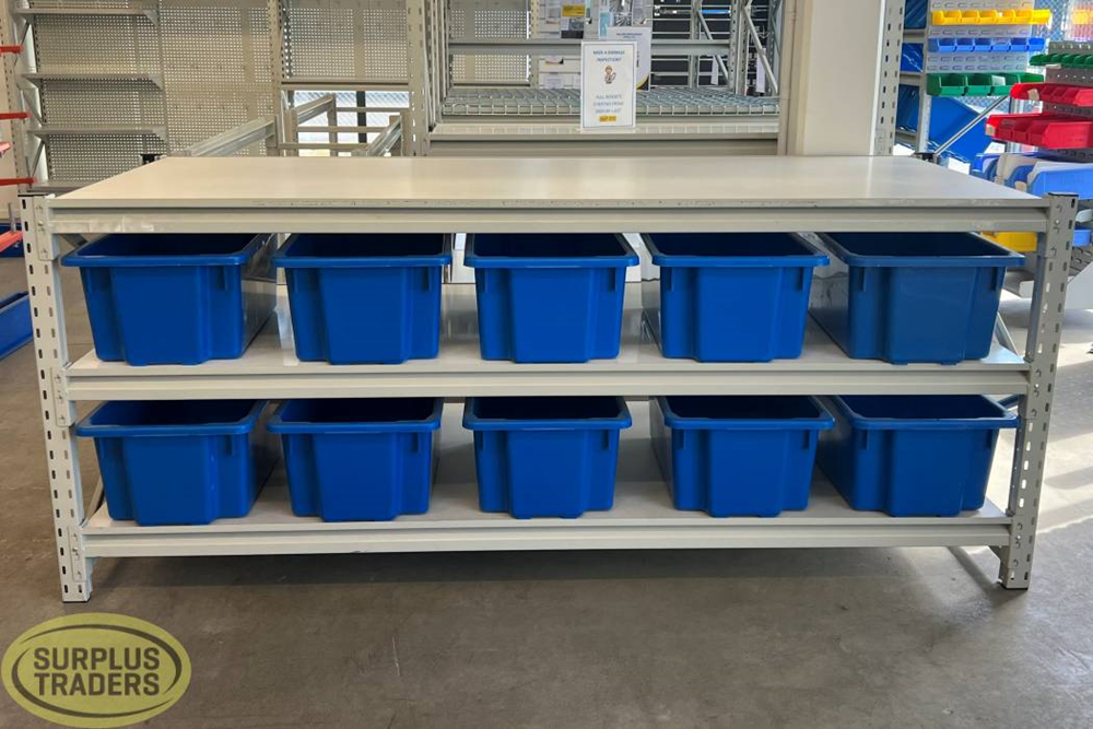 New Ivory ST Longspan Workbench with 10x 52L BinsHeight 1000 mmInternal Width 2300 mmOverall Width 2430 mmDepth 900 mmWeight Load Rating 350 kg per levelLevels include 2 Beams and Wooden Shelf (Factory Second Melamine - Can vary in colour)Additional bays and levels can be added – please ask us for a quote that suits your needs.Other Sizes and Configurations Available.Call us or Enquire Now for Details and Pricing.We will exchange/refund or credit where new goods have been incorrectly described/are faulty or different from the example shown.We do not refund if you have changed your mind/have chosen the incorrect size/colour etc..