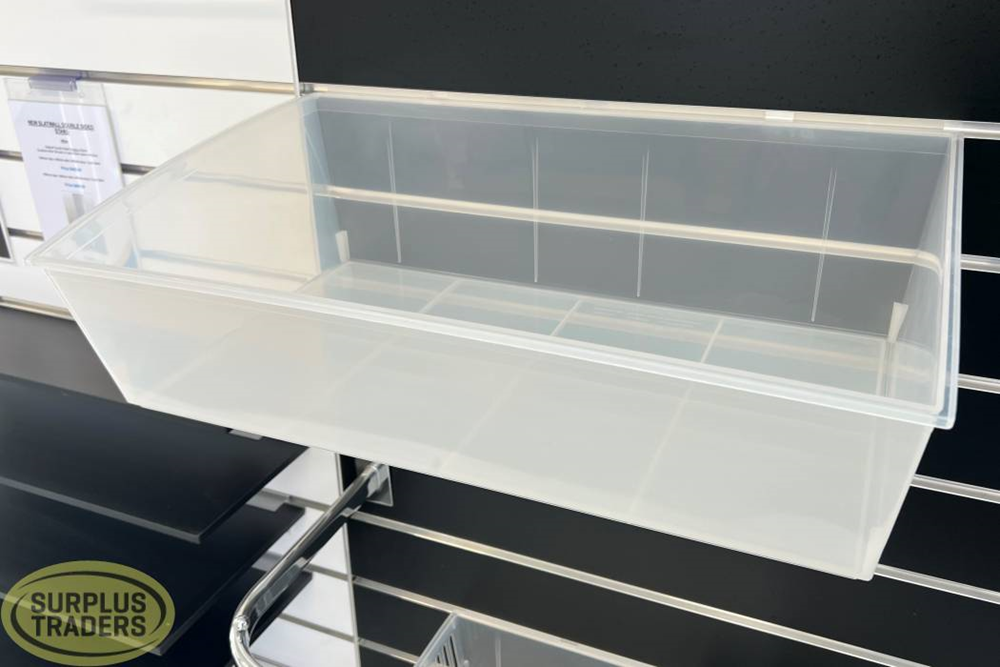 New Slatwall Plastic Parts Box 357mm long x 565mm wide x 183mm highColour: ClearDesigned to clip into Slatwall panels Call Us or Enquire Now for Pricing and Stock AvailabilityWe will exchange/refund or credit where new goods have been incorrectly described/are faulty or different from the example shown.We do not refund if you have changed your mind/have chosen the incorrect size/colour etc..